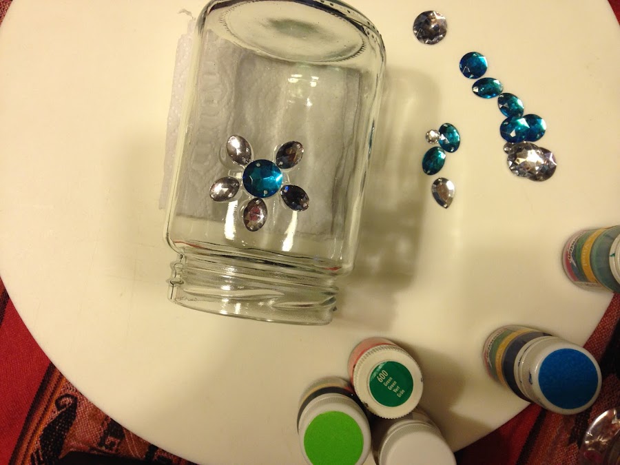 Materiales: frasco de vidrio, pasta relevo para falso vitraux, pegamento transparente, adornos brillantes facetados. Limpiar el frasco con alcohol antes de trabajar.