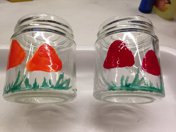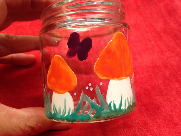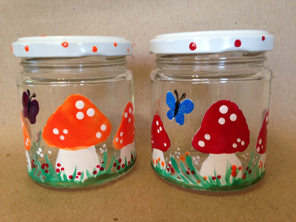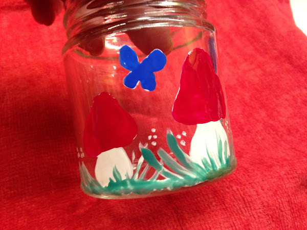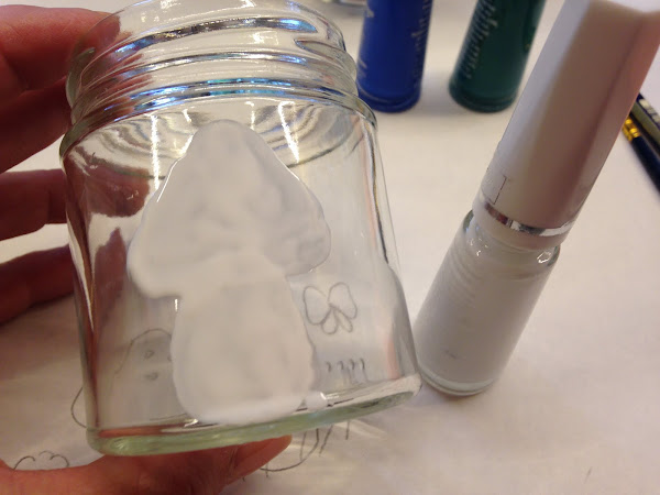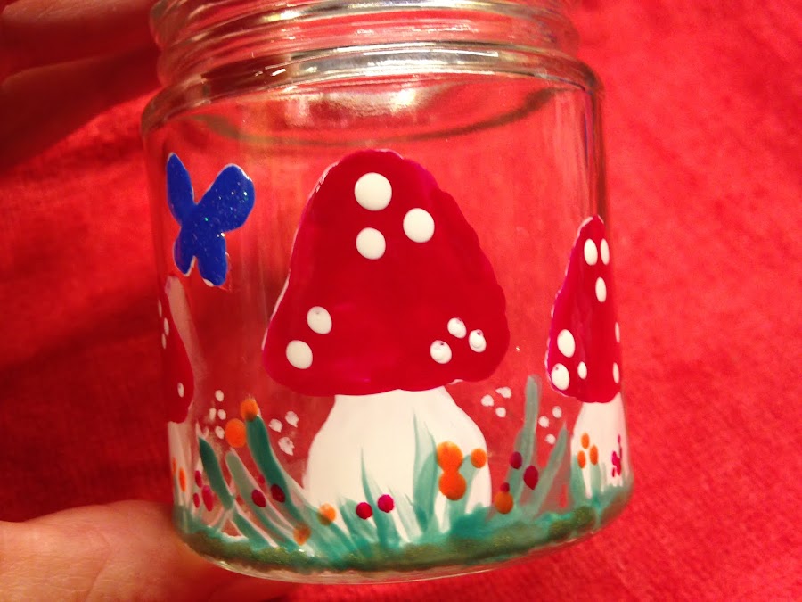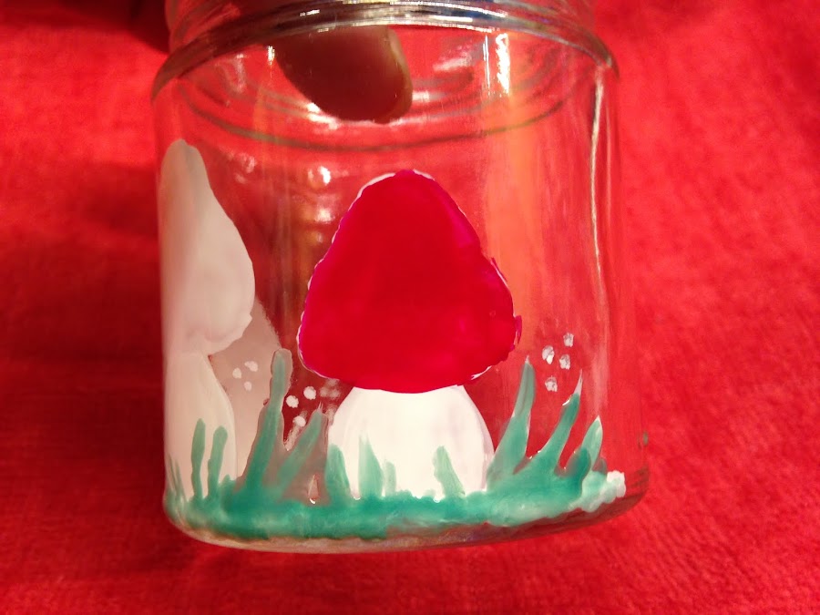 Luego los detalles. Los lunares del hongo los hice con esmalte blanco y la punta del pincel. De igual manera las flores.