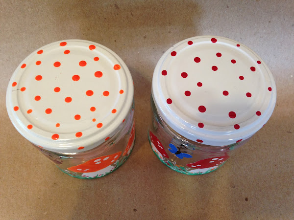 Para la tapa lunares salpicados al tono de los hongos. Todo hecho con los mismos esmaltes.