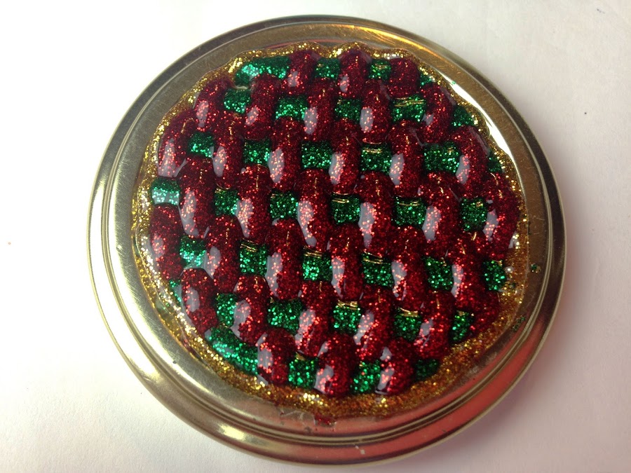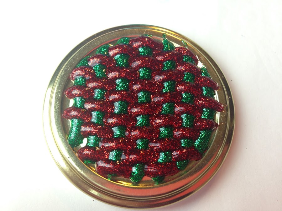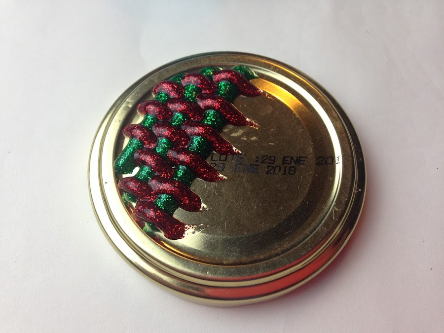 Para la tapa, con cola vinílica de dos colores comenzar a entretejer, hacer primero una línea con verde y luego con rojo, pequeñas líneas laterales, como si fuera un tejido de mimbre o de canasta. Así hasta terminar de cubrir.