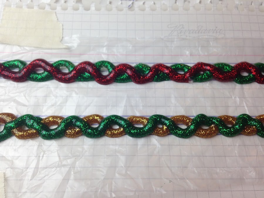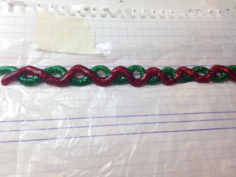 Sin necesidad de que se seque la primera hilera, realizo otra por encima con un segundo color. Luego dejo secar muy bien.