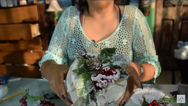 Sobre la tapa decoramos con un par de hojas artificiales y muérdago