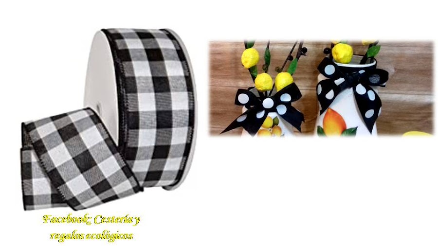 En la decoración Farm House regularmente se utiliza el listón cuadrillé, pero si no lo consigues podemos sustituir por cualquiera en tonos blanco y negro o alguna tela en estas tonalidades...