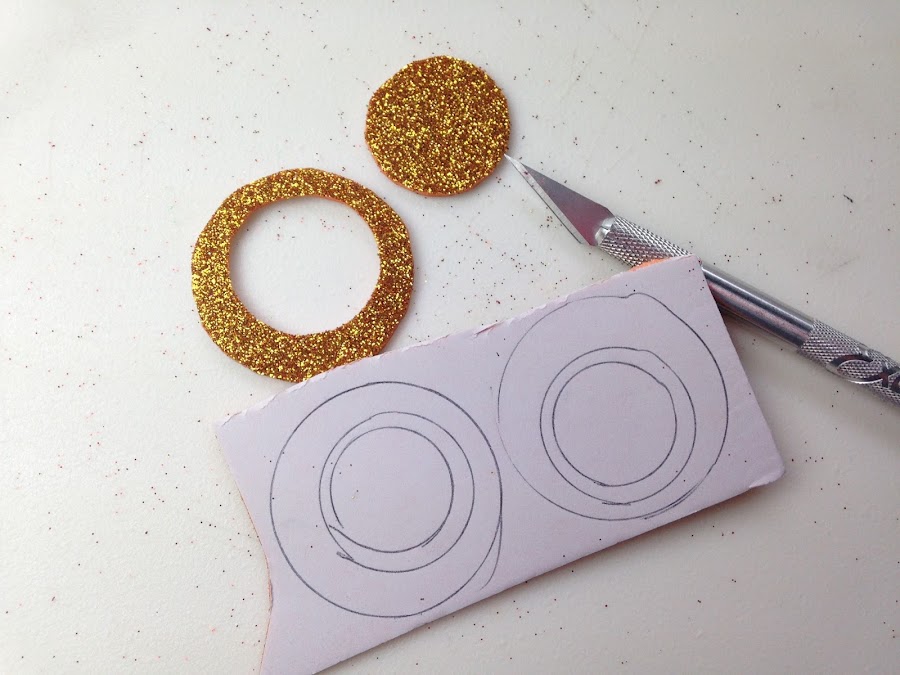 Dar vuelta la Goma Eva y del lado del revés, donde esta el papel marcar los círculos de distinto tamaño. Recortar por fuera con tijera y pos círculos interiores con cuter.