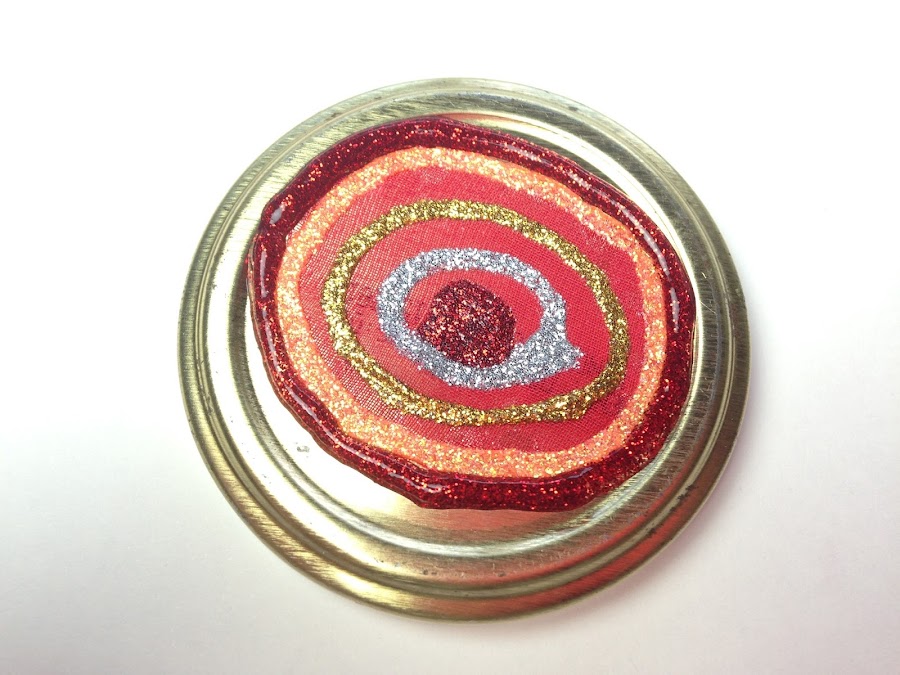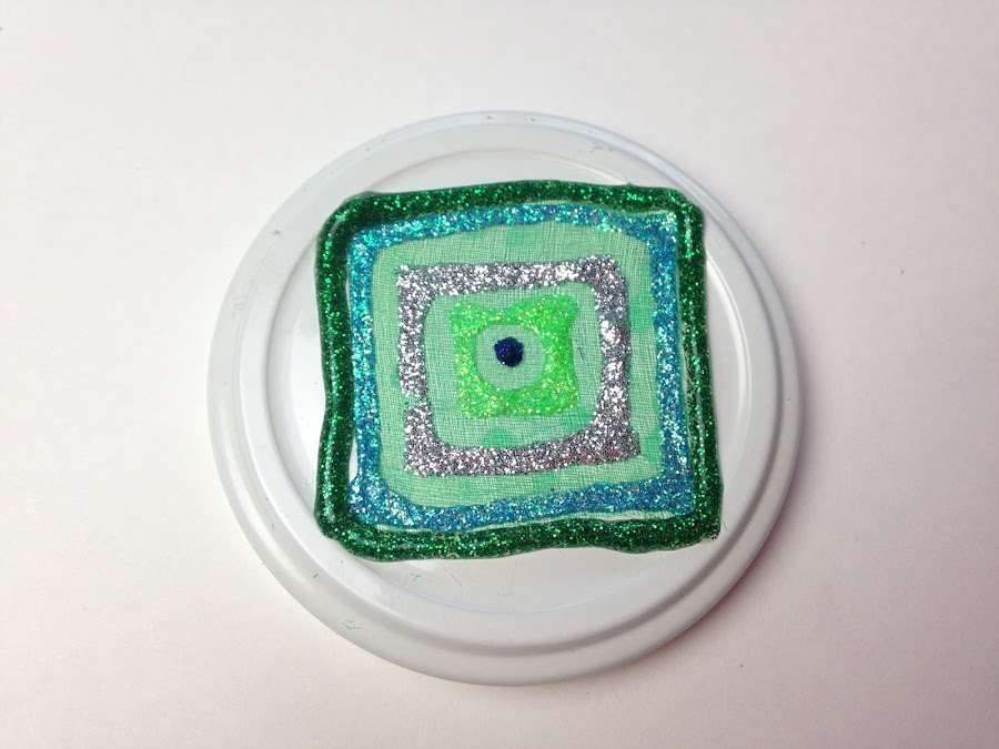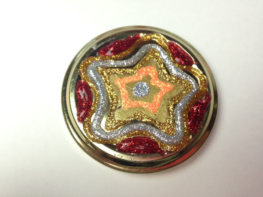 Para las tapas, recortar las figuras que correspondan a cada frasco y pegarlas y trabajarlas del mismo modo con el glitter.
