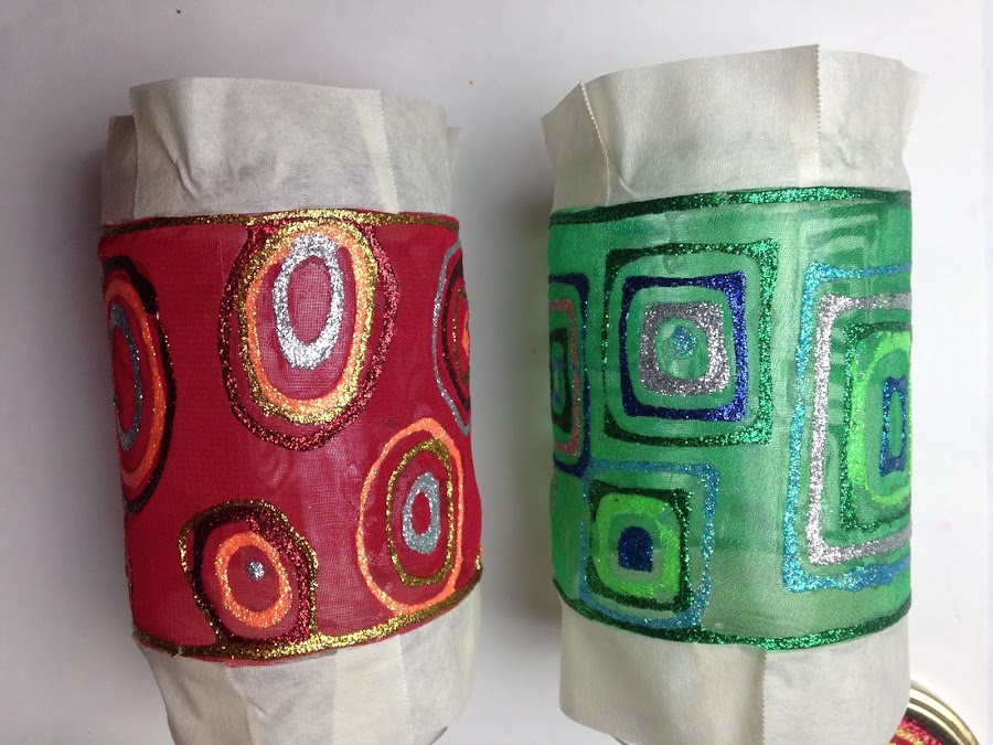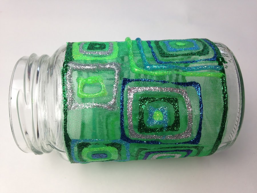 Se deja secar en posición horizontal unas horas, se despega del nylon, se recortan los bordes y se posiciona en el frasco para ver como queda. Se da vuelta y se coloca pegamento en las zonas en donde estan los dibujos y en los bordes y se pega.