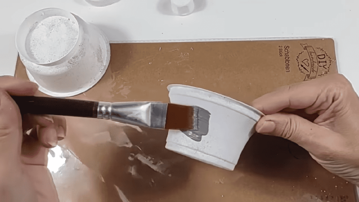 pero como yo quiero hacer los farolitos voy a pintar los envases de postres y las tapitas con pintura acrílica blanca aplicada de a toquecitos con una esponja para que se adhiera mejor sobre esta base voy a pintar con pintura color gris que forme con tres partes de blanco y una de negro les voy a dar dos manos y voy a dejar secar