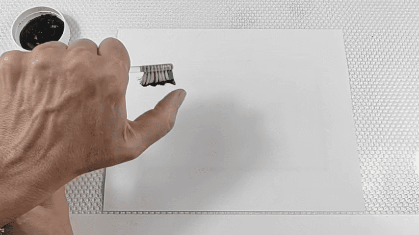 ahora con este cepillo de dientes viejos y pintura acrílica negra voy a hacer un salpicado poniendo el dedo pulgar sobre la cerda y haciendo este movimiento porque quiero lograr un efecto enlosado.por eso también con el cepillo le voy a aplicar pintura acrílica blanca de igual manera.