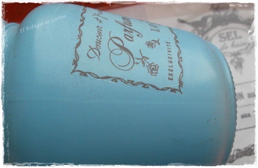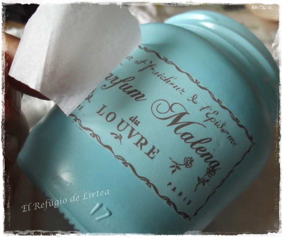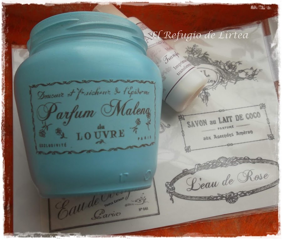 Hay que dar una capa del medium especial para este tipo de transferencias sobre el bote, colocar la trasferencia y retirar el papel que la protege una vez que hacéis presión para que se quede bien pegada.