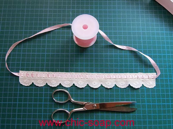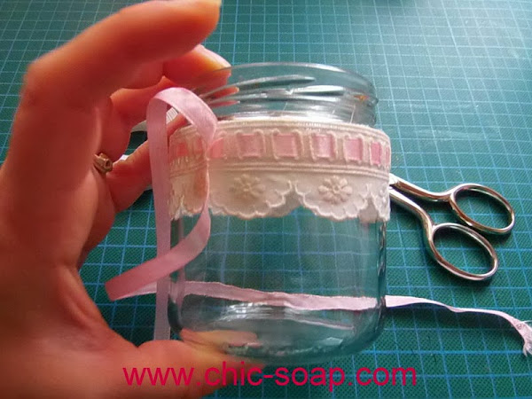 b) En mi caso he utilizado un trozo de puntilla con pasacinta del diámetro del frasco y cinta bebe de 10cm a 15cm más grande que la puntilla por cada lado. Cuando hayáis pasado la lista y medido el sobrante para cada lado (solo en ese momento) giráis la puntilla del revés y le colocáis por todo lo largo cinta de doble cara.