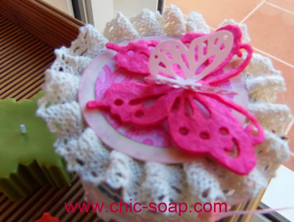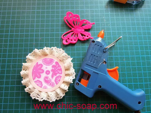 - Después de terminar de colocar la puntilla pega los círculos superpuestos sobre la tapa. La mía ha quedado así: