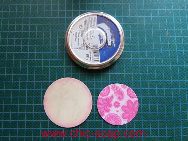 d) Ahora vamos con la tapa.- Corta dos círculos (más pequeños que la tapa) de papel, de diferentes diseños para que hagan contraste y reserva.- Con cinta de doble cara o la pistola de cola pega una puntilla al rededor de la tapa. Si lo haces con la pistola de cola no te excedas en poner pegamento porque sino te quedaran relieves.