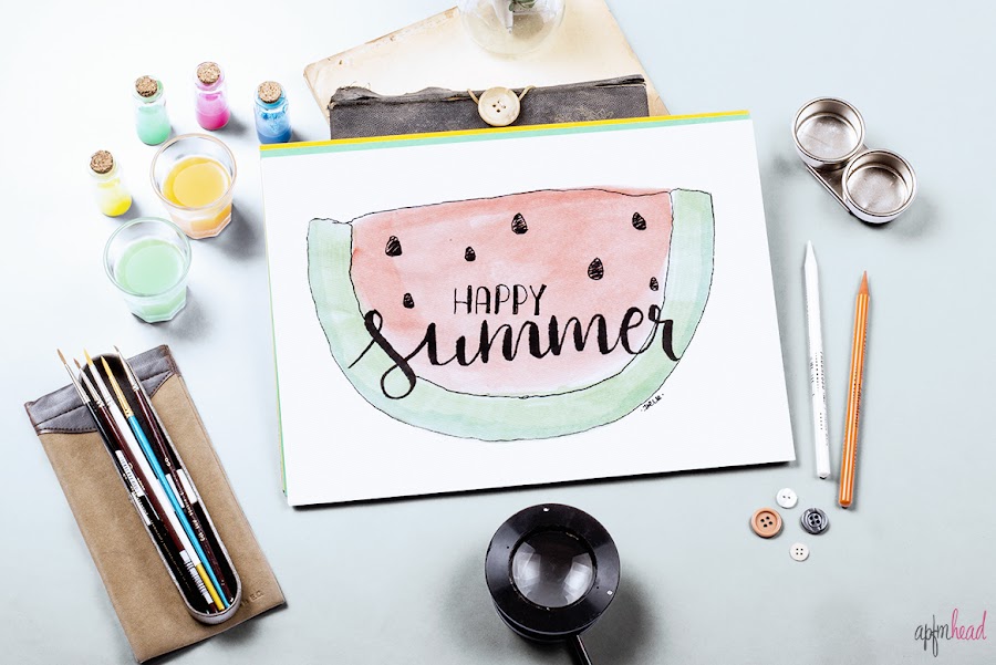 Cogí papel, las acuarelas y me puse a pintar. Quería crear algunas cositas para un correo fresquito que tengo pendiente de enviar a finales de mes y salió esta sandía. Como últimamente estoy practicando crear letras bonitas acabé escribiendo dentro del dibujo.