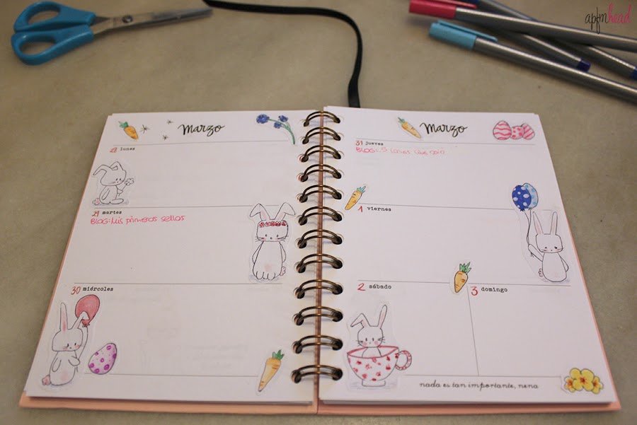 Yo ya las he colocado en mi agenda decorando la semana de pascua. Os gusta como ha quedado? Voy a ser buena y tendréis más de un conejo de casa en la lámina de pegatinas que os he montado.