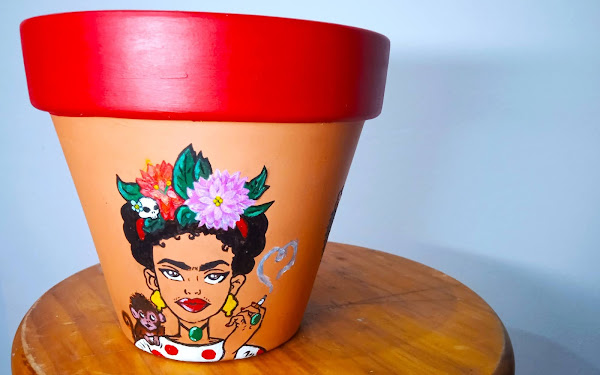 Esta es mi nueva maceta pintada de Frida Kahlo.