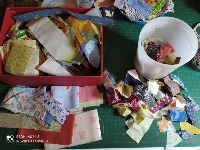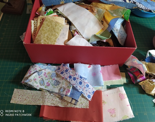 ... Y en esta caja guardo mis tiras y cuadrados de telas. Tengo más cajas con trocitos de telas, pero con estos comencé a trabajar....
