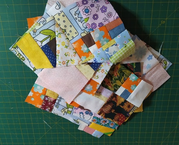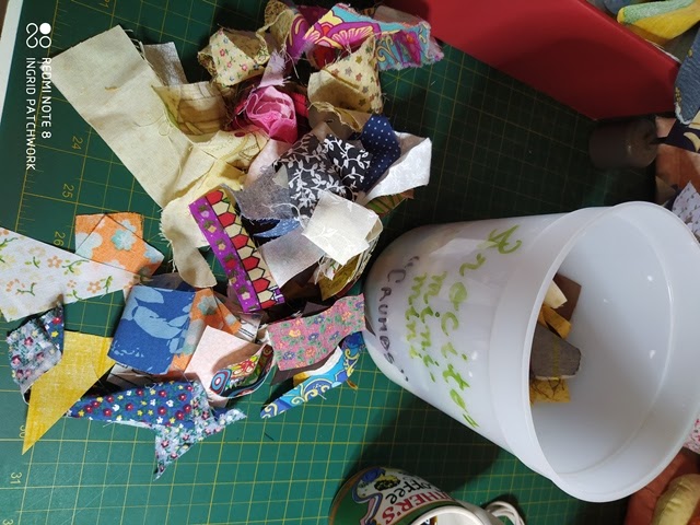 Me encanta el efecto de todas estas telitas juntas, sin buscar combinaciones de telas, ni estar pendientes de que esta es clara, esta media y esta otra es oscura. Nada de eso. Sólo coser. Eso si. Les digo que el taller queda super sucio de tantos recortes que se hacen. Es lindo ver de nuevo esas telitas que ya se nos acabaron, pero que habíamos atesorado aunque fuera un trocito ...