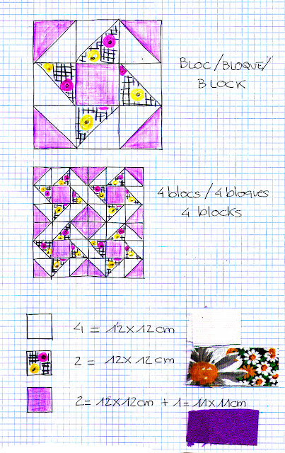 Después de cuadrar y planchar, ya tenemos el bloque hecho, que podéis ver en el anexo. También os hemos hecho el esquema de cuatro bloques montados, para que veáis el efecto, más las medidas y cantidad de los tejidos.