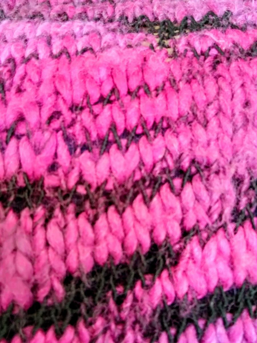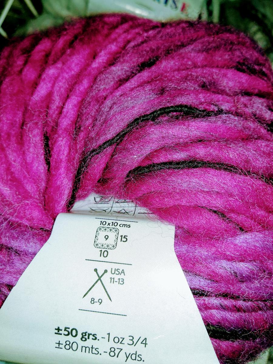 Me encanta esta lana Surprise de Lanas Katia ya que mezcla en la misma hebra de mecha trozos gruesos en color fucsia y trozos más finos en negro.