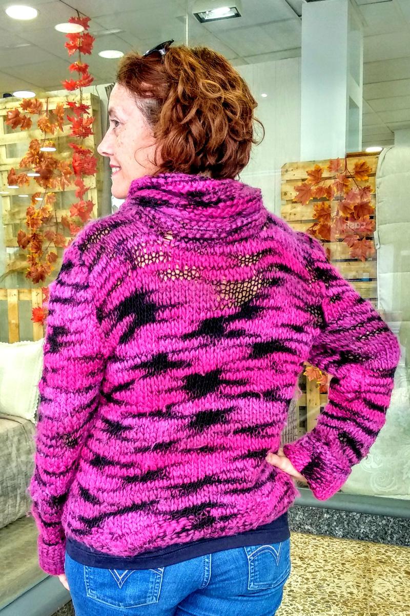 Cómo quería hacerlo rápido y que quedase el punto flojo lo tejí con las agujas del n°9. Todo el jersey está realizado a punto liso y el cuello a punto bobo. El bajo y los puños es a punto elástico 5×5.