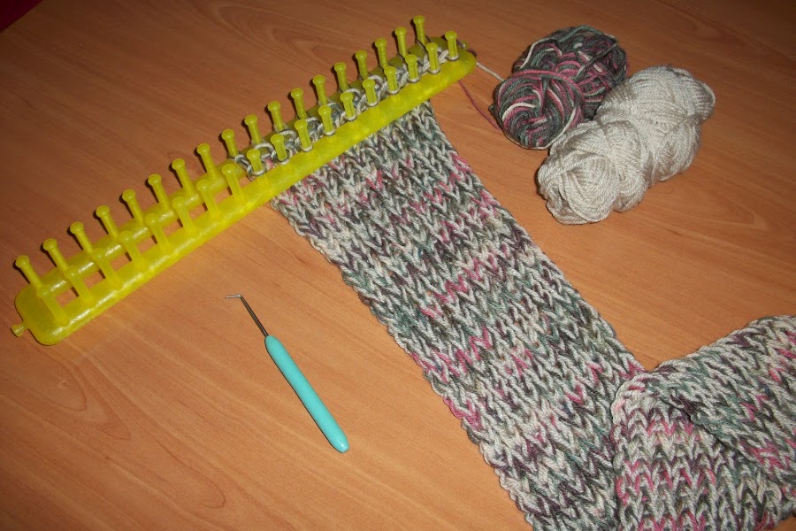 He usado lana doble para que no quede tan delgada, ya que no he encontrado lana con el grosor que quería, por lo que he combinado estos colores, marrón muy clarito y una madeja con varios tonos de colores.