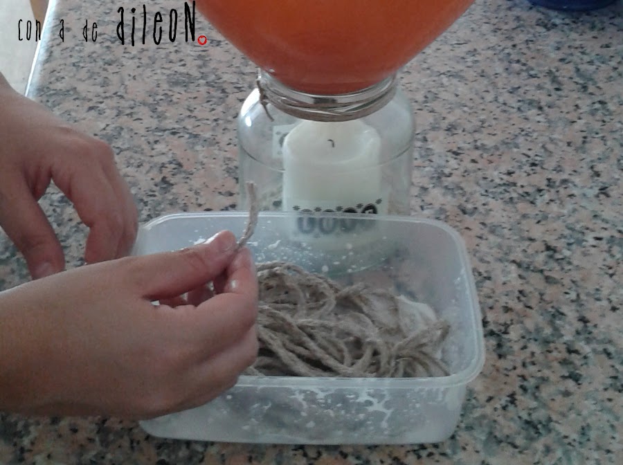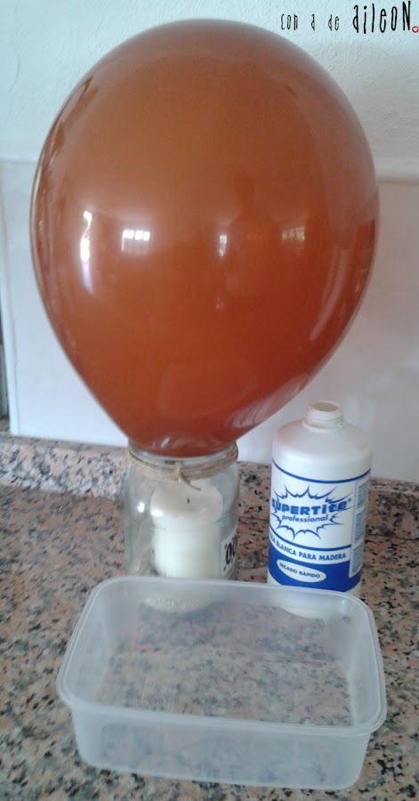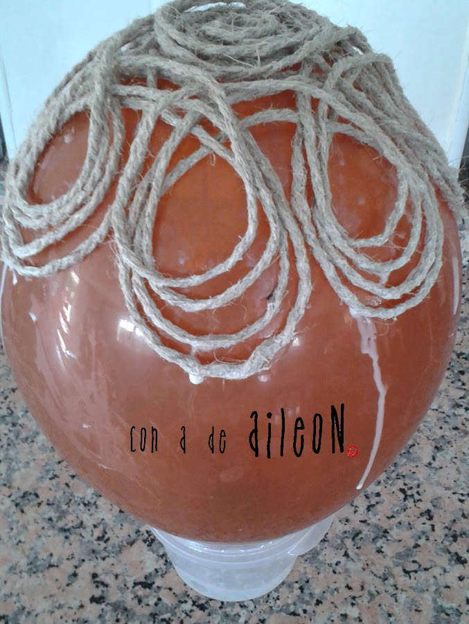 Empezaremos mojando la cuerda (yo corté aproximadamente 5m) en una solución de cola + 1/3 de agua (en función de la cantidad echada de cola blanca) e hinchando el globo y colocándolo en posición vertical.