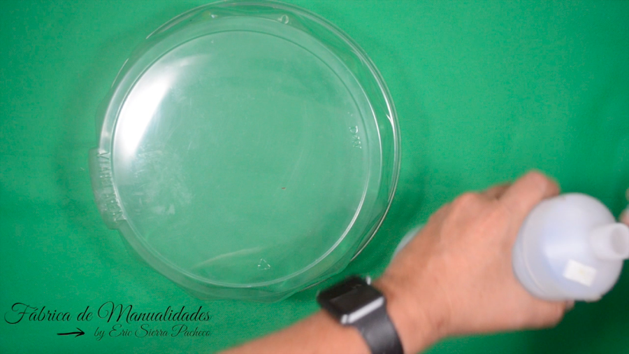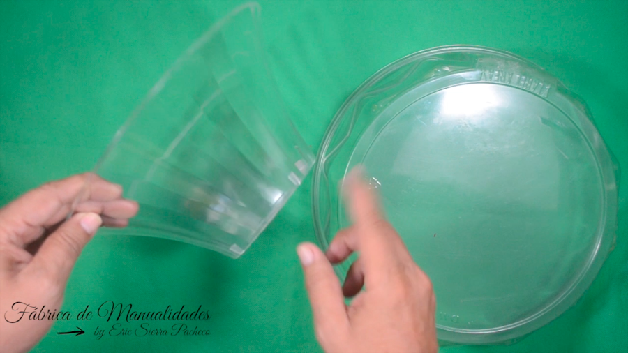 1. Necesitamos la tapa de recipiente desechable donde vienen los pasteles o tortas. También un recipiente como el de la izquierda de la imagen, este lo compré en una tienda de manualidades por menos de un dolar.