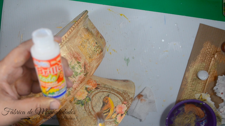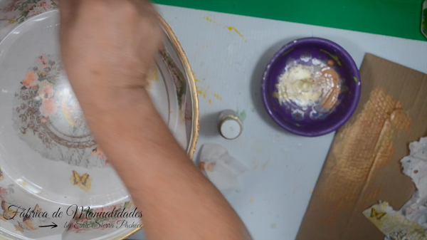 18. Usando pintura acrílica en color cobre y dorado le damos pincel seco a todo el Frutero.