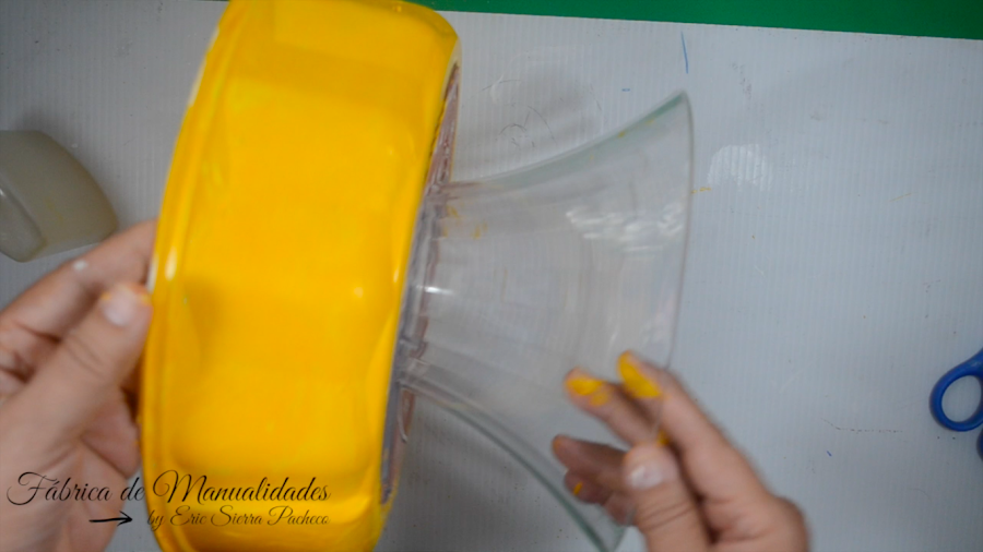8. Una vez seco el decoupage le vamos a aplicar una capa de pintura acrílica blanca y después una capa de pintura amarilla para quitarle lo demasiado bvlanco. Puedes usar un color vainilla para no hacer esta combinación.