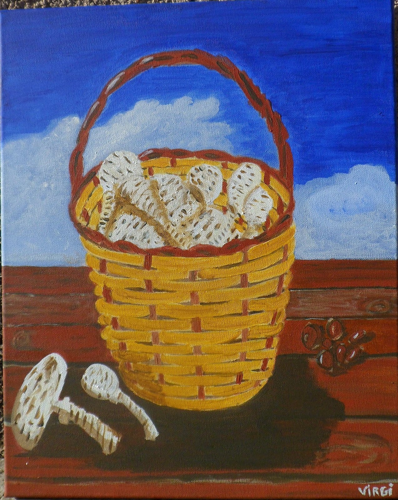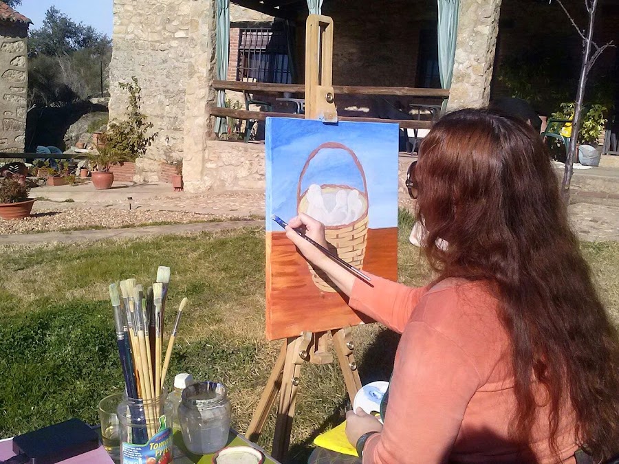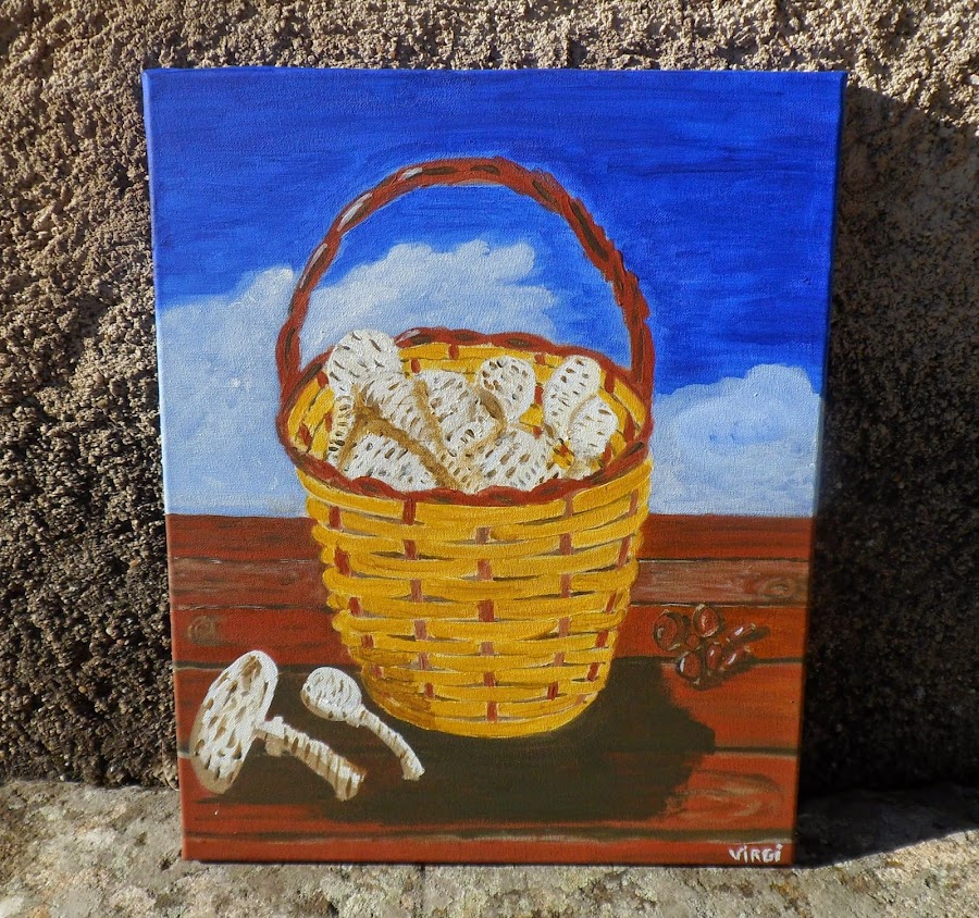 Hacía mucho que no me deleitaba con el placer de pintar, algo que me encanta, me relaja y me llena de vida; y aprovechando estos días de fiesta y este sol de invierno tan agradable, por fin me decidí a terminar un cuadro que hace mucho que empecé... Se trata de un bodegón compuesto por una cesta repleta de setas, acompañados de unas castañas y bellotas, todos "frutos de otoño" como me ha parecido lo más adecuado titular esta obra. He querido darle mucho color a todo el conjunto, de ahí el cielo tan azul contrastando con el amarillo mostaza de la cesta y la mesa de madera.