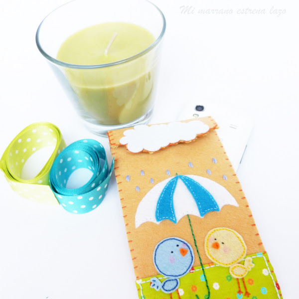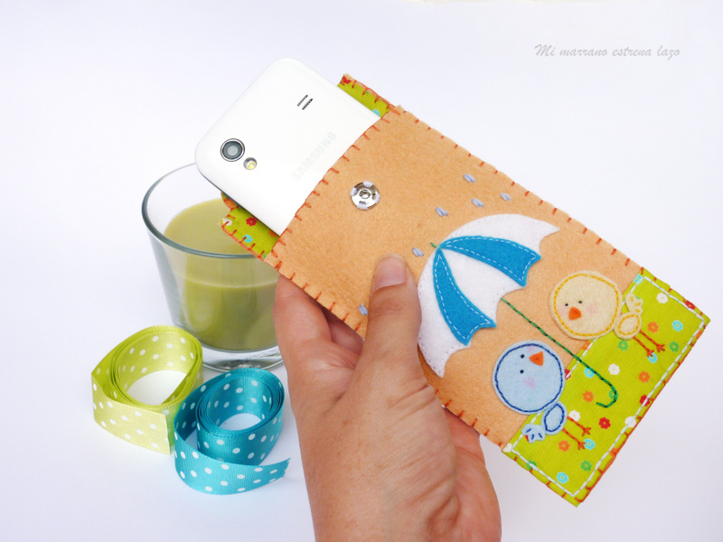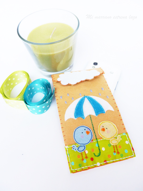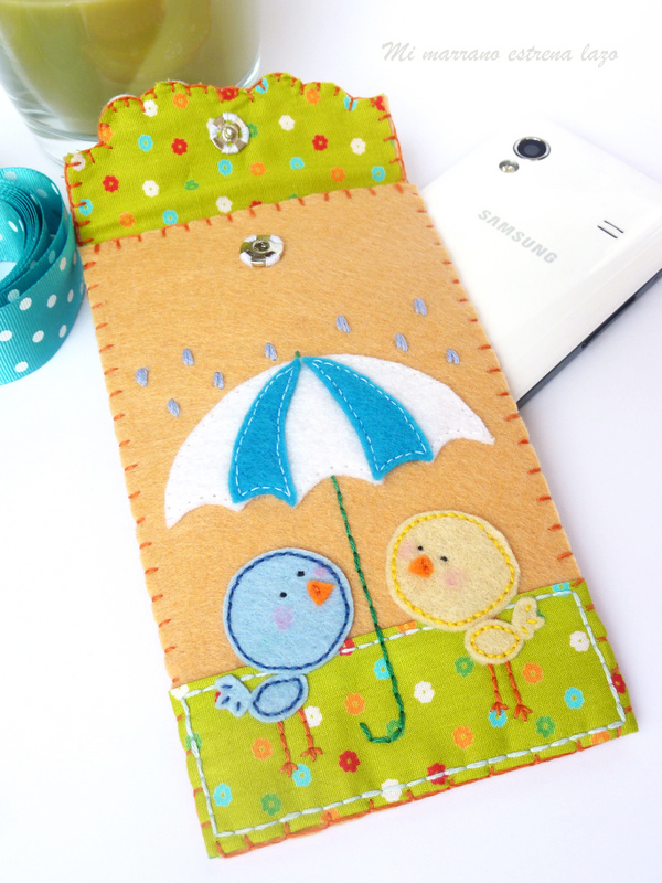 Los protagonistas de esta simpática funda, son dos pajarillos, a los que les pilló una tormenta de Septiembre, de esas que ya nos traen el otoño. Son muy graciosos y buenos amigos porque comparten paraguas.