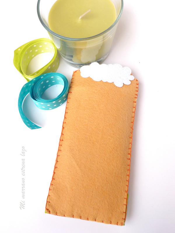 La funda está realizada en fieltro naranja claro y tela verde con flores de colores estampadas, esta tela tambien es el forro interior, donde va escondida la etiqueta de Mi marrano estrena lazo. Los pajarillos son de fieltro, bordados a mano, lo mismo que el paraguas y las nubes que esconden el automático que cierra la funda.