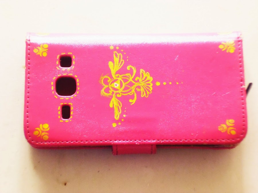 Los símbolos dibujados sobre la funda están hechos con pluma dorada de gel, no tengo idea de por que en las fotos se ve todo amarillo. Lo que me gusto de trabajar con las plumas de gel, fue la facilidad para manejarla sobre la superficie de la funda.
