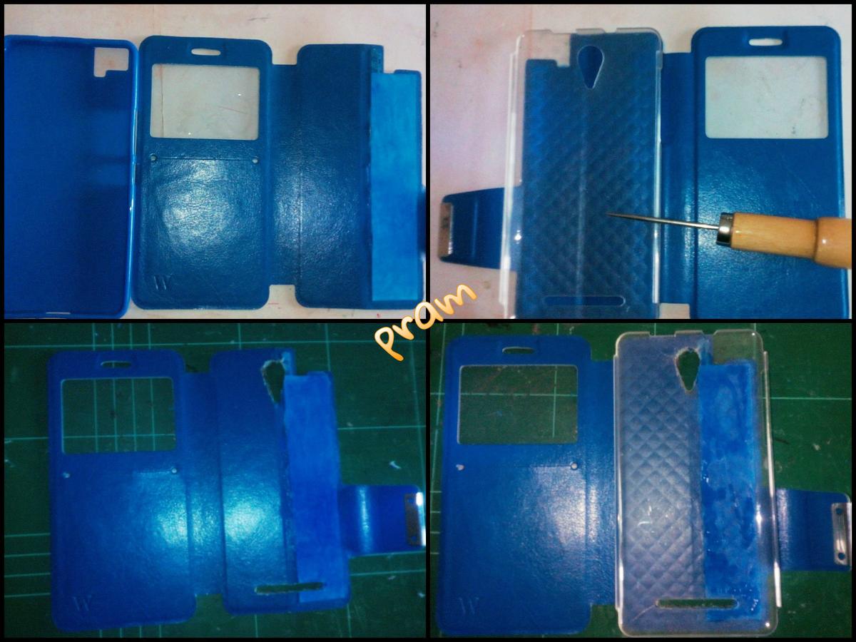 1. Con cuidado, separamos de la tapa trasera, la pieza de plástico que sujeta el teléfono. Nos ayudamos del punzón o mejor, del cúter. Como la funda que voy a poner es transparente y se ha levantado un poco la tela de la tapa, he cubierto la zona pelada con un papel azul, al que he dado un par de capas de pintura acrílica, similar al color de la funda para que el contraste fuera menor.