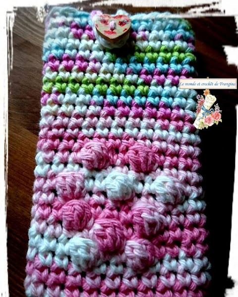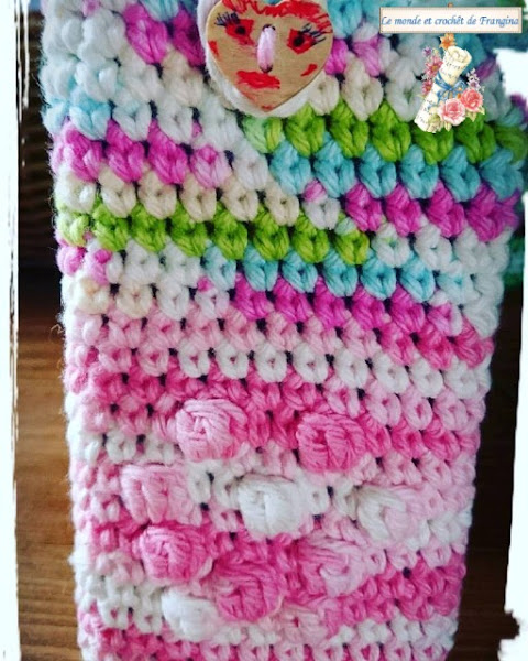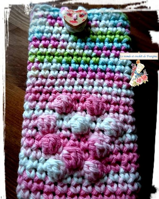 Tejí en espiral hasta la altura que me pareció para hacer salteados unos cuantos puntos pop-corn para darle realce a la parte delantera de la funda.