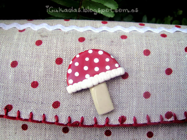 Y para rematarla, le puse algún detalle de picunela y algunos botones, clásicos botones de plástico que tienen nuestras madres en una caja y que acumulan durante décadas, y un par de botones de fimo, hechos ex profeso para la funda y que no podían ser otra cosa que setas, aunque no les hice los agujeritos típicos de los botones, si no más bien como apliques para pegar.