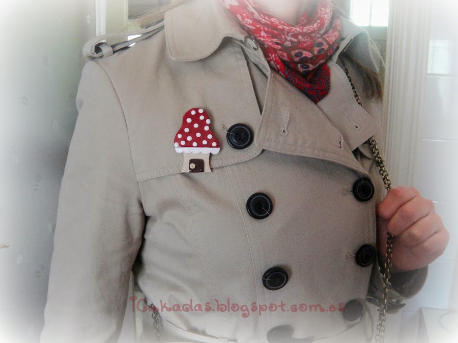Y ahí no quedó la cosa, me ha dado tan fuerte por las setas que he hecho una minicolección de broches de casitas tipo seta que también os enseñaré, y que recién terminada ha volado de mis manos. Una buena amiga vino a casa cuando los acababa de terminar, y entró en el taller a ver las nuevas creaciones, y este fue el resultado.