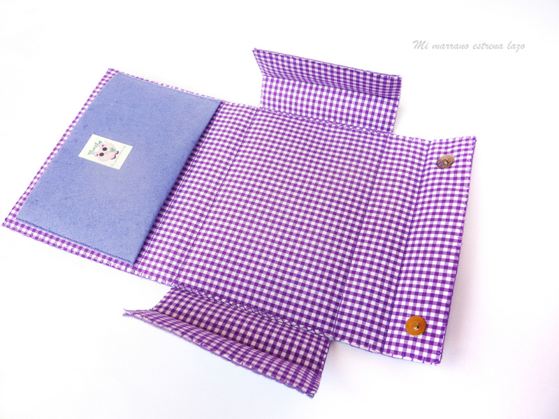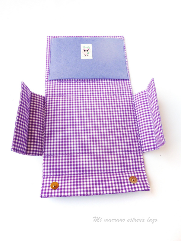 Está realizado, de dentro a fuera, por una tela de algodón de cuadros violetas, entretela con mucha consistencia y que se endurece una vez se ha pegado a la tela, guata, cartulina y fieltro de 2 mm . Exceptuando el fieltro exterior, todos los demás elementos van cosidos entre ellos, y el fieltro al conjunto.