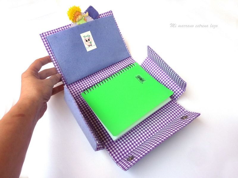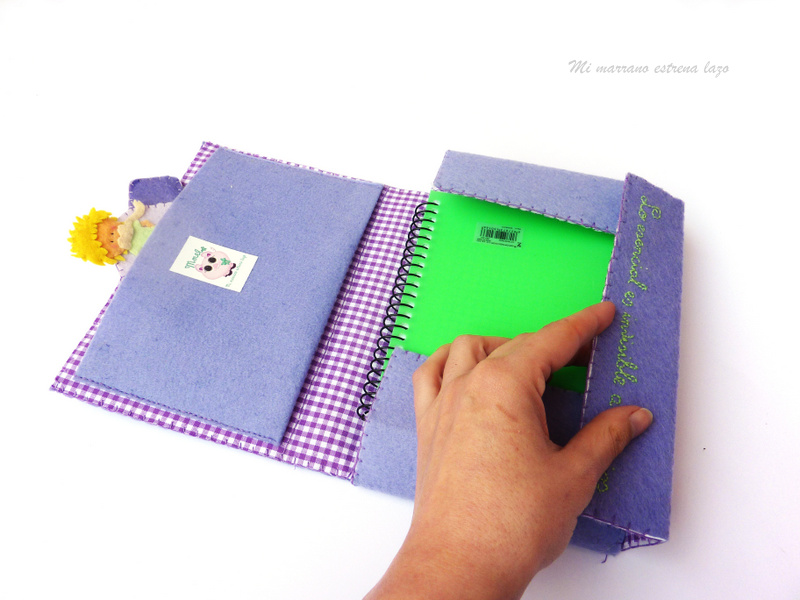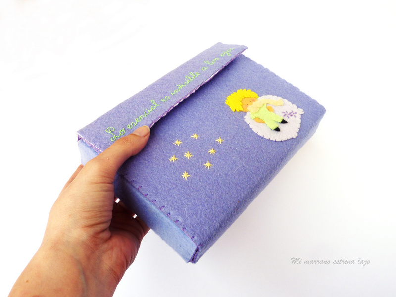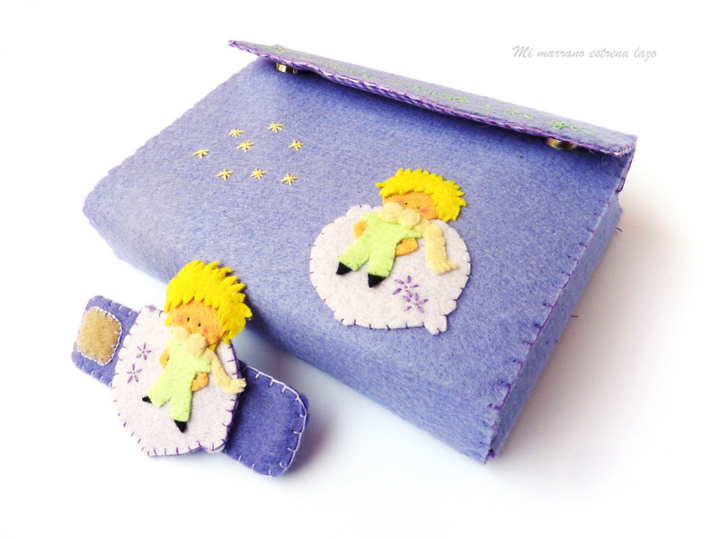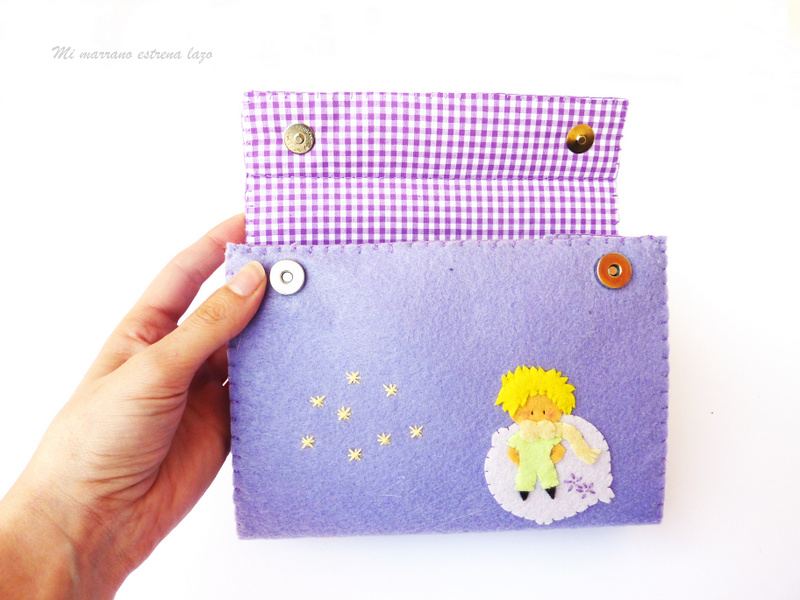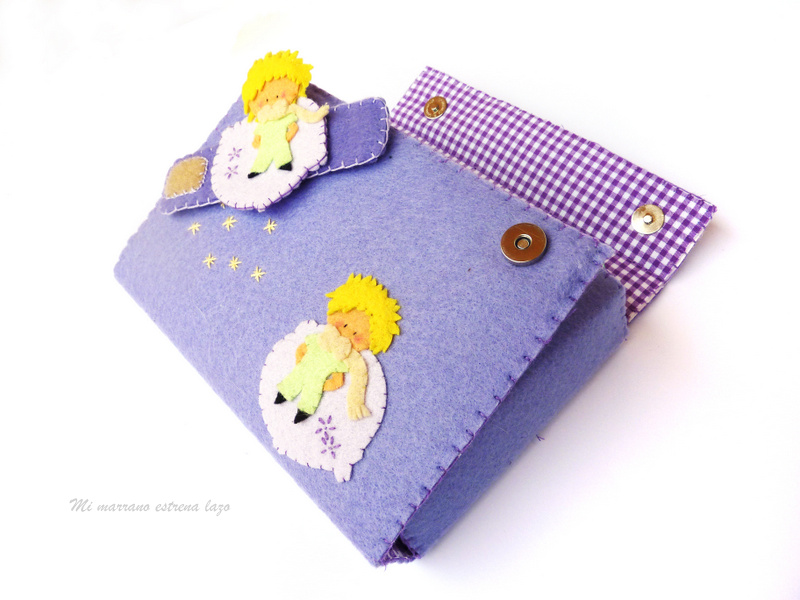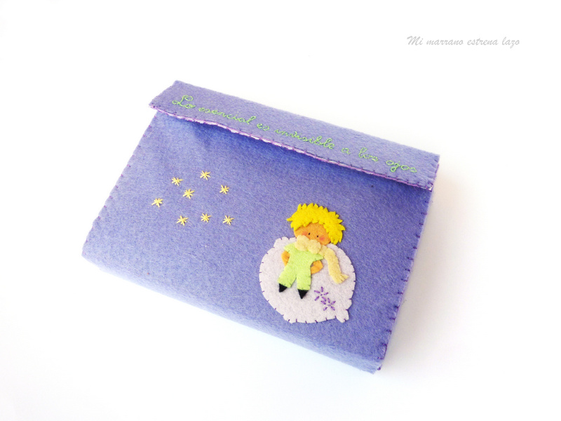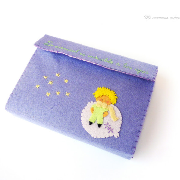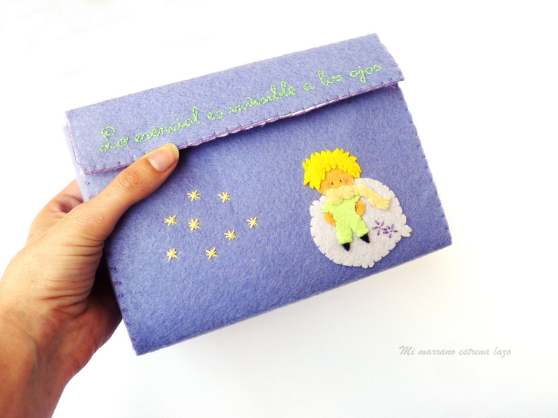 Lleva dos cierres de imán y al Principito realizado en fieltro en la parte delantera, en la solapa de cierre va bordada la frase: "lo esencial es invisible a los ojos"