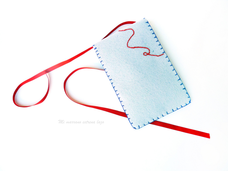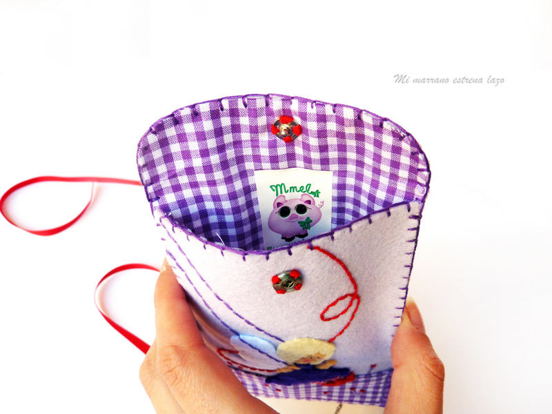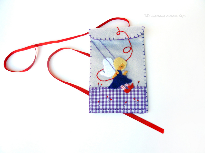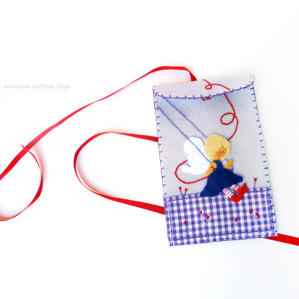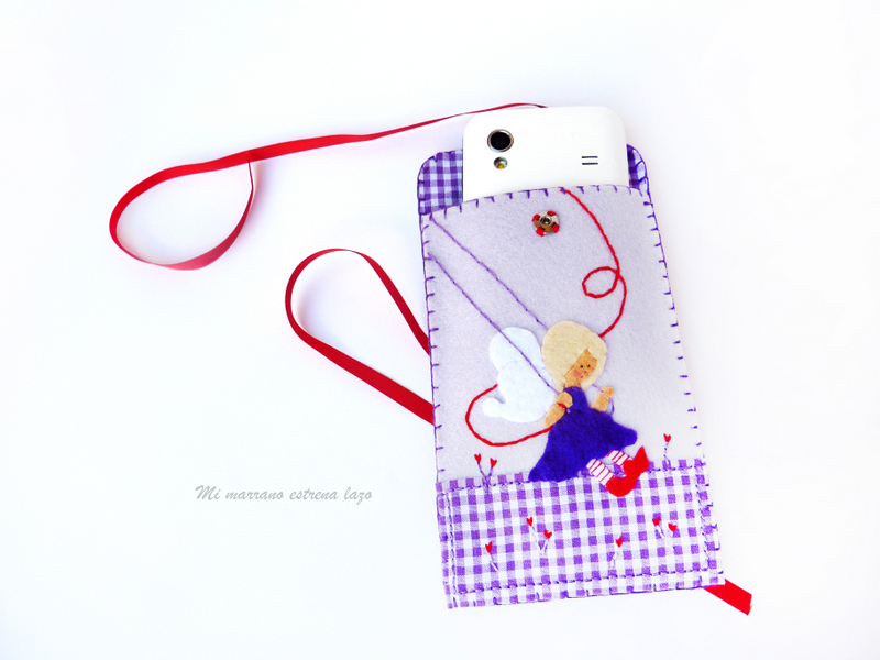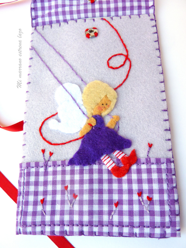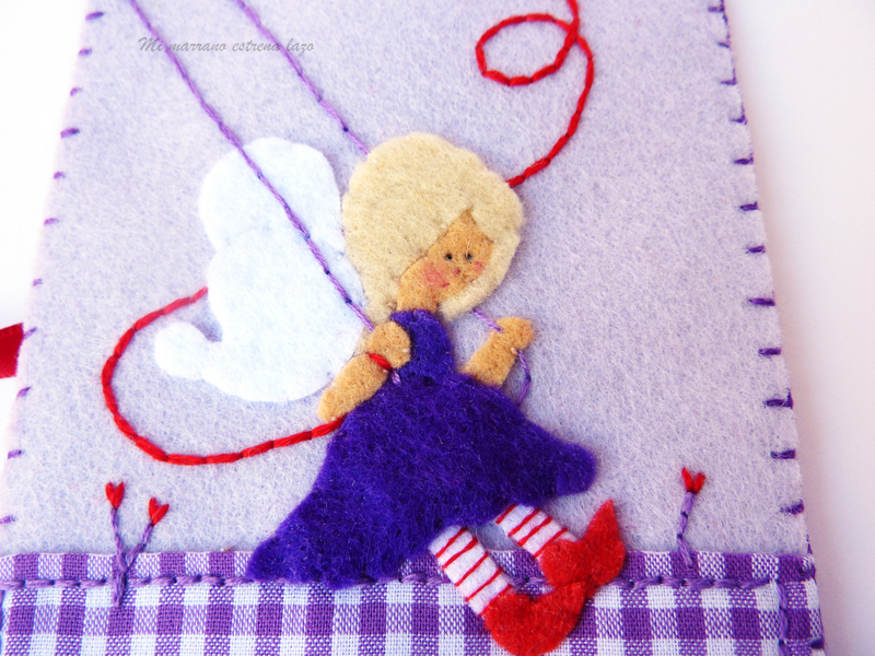 La funda tiene unas medidas de 14 cm de alto por 8,5 cm de ancho. Esta realizada en fieltro violeta claro (en algunas fotos el color no se aprecia muy bien, en la última parece azul, pero no lo es ;)) y tela de algodón de cuadritos violetas en el forro interior y en la base de la parte delantera.. La niña hada está realizada también en fieltro y cosida totalmente a mano, el cierre es corchete cosido con hilo rojo ( Tengo que deciros que el sistema de cierre de todas las fundas va a cambiar, dentro de muy poco todas irán con botón de imán ;) )