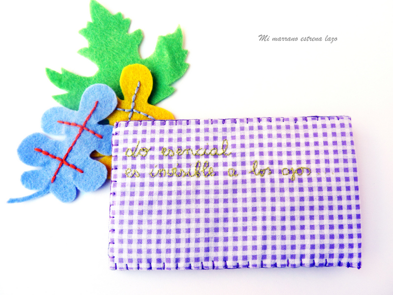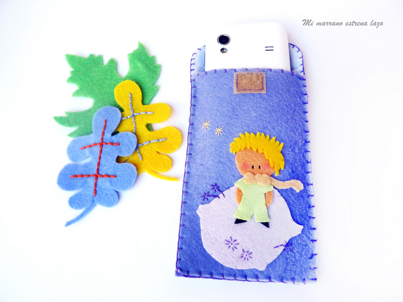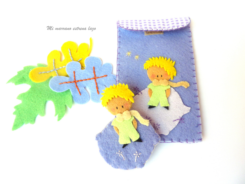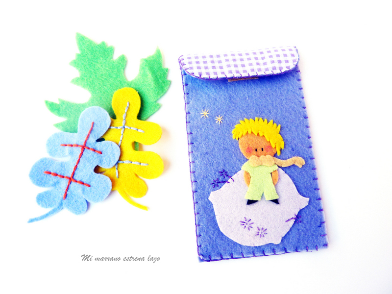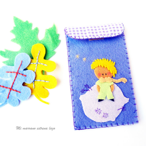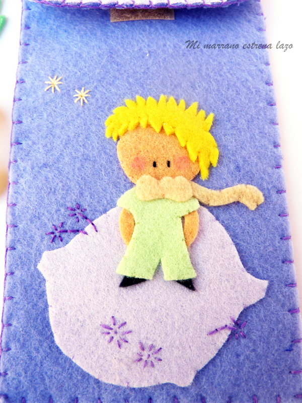 La funda está realizada en fieltro y tela de cuadritos violetas. El principito es de fieltro y la parte trasera tiene bordadas a mano una de las frases más conocidas del libro "Lo esencial es invisible a los ojos" La tela del forro es de algodón blanco.