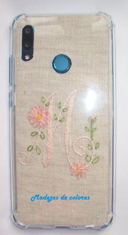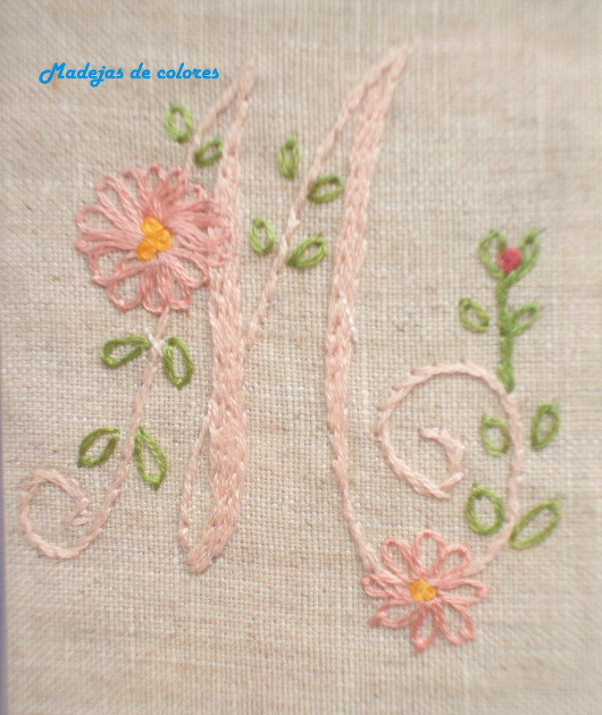 Sobre lino natural, a punto tallo y con un suave rosa empolvado, bordé la M.