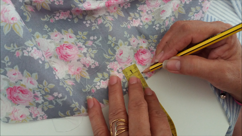 Ahora, hacemos un ojal por donde pasaremos luego la cinta decorativa. Para hacerlo marcamos el ojal a 1 cm del borde. El tamaño del ojal será de 1,5 cm y lo marcamos sobre la tela