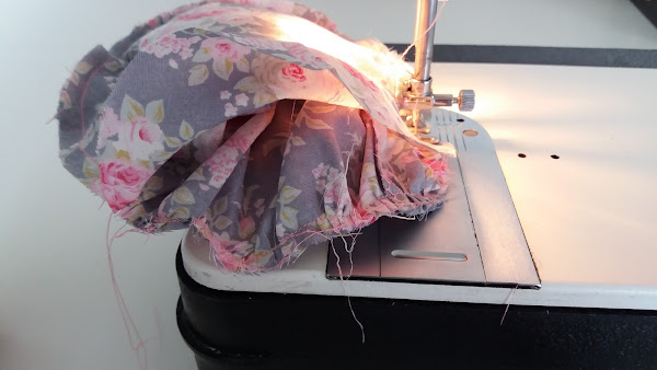 Una vez sacadas las medidas y preparadas las piezas de tela, empezamos por pasar dos costuras, la primera a 1 cm del borde de la pieza de tela principal (parte de arriba). Lo vamos a hacer con una puntada ancha para poder hacer el rizado sin dificultad.