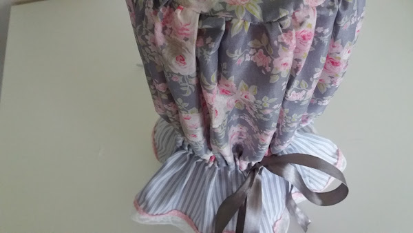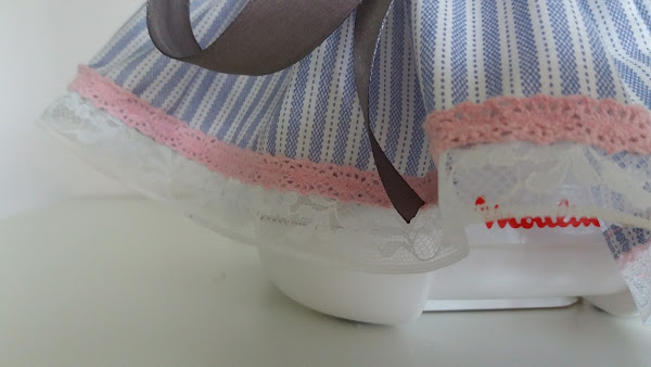 Ahora es momento de hacerle el bajo a la funda. Simplemente hacemos un dobladillo para hacerle el ruedo o bajo y encima cosemos las tiras de encaje, en mi caso he puesto una encima de la otra para darle un poco más de vistosidad.