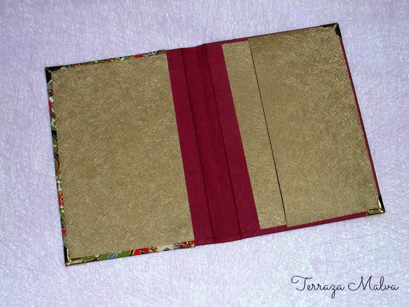 En la parte delantera he utilizado una tela con bonitos motivos japoneses. En la trasera y canto una tela de encuadernar en tono burdeos. Y en el interior un papel vinílico para las guardas y el bolsillo en donde se insertará la trasera de la propia agenda para sujetarla al conjunto.