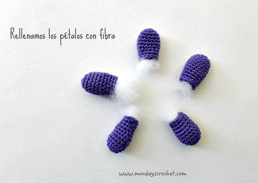 VUELTA 2: Tejemos 1 c.a.d. de subida y 1 p.b., 1 aumento 2 p.b.jun. Repetir. En total 16 p.b. Cerramos con 1 p.c.
