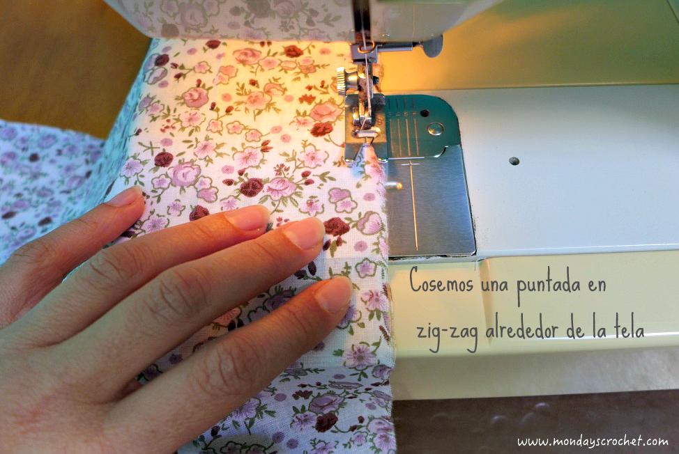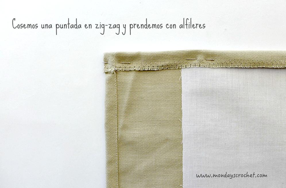 Con hilo de color blanco, cosemos en la máquina una puntada en zig-zag alrededor de toda la tela estampada. Marcamos el centro de nuestras telas y las alineamos para que la tela estampada quede en el centro de la loneta.