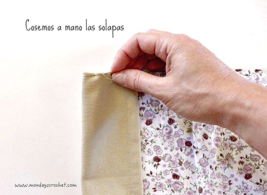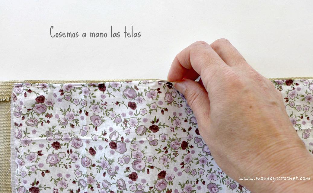 Hacemos un dobladillo en la parte superior de la tela estampada. La prendemos con alfileres a la loneta camel y lo cosemos a mano con hilo blanco y puntadas pequeñas. Dejamos el lado inferior sin terminar hasta que cosamos los adornos de la funda.