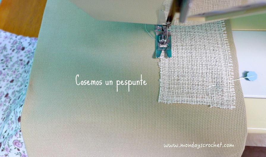 En la portada de nuestra funda vamos a coser 2 telas de algodón y la flor de crochet. Con hilo de color beige cosemos en la máquina un pespunte alrededor de la tela de algodón. Dejaremos 1 cm para hacerle un efecto deshilachado.